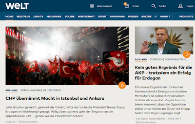 «Τa χθεσινά αποτελέσματα δεν είναι καλό αποτέλεσμα για τον Τούρκο Πρόεδρο Ρετζέπ Ταγίπ Ερντογάν» γράφει η γερμανική εφημερίδα Die Welt και προσθέτει: «Η Άγκυρα, πρωτεύουσα της Τουρκίας και το κέντρο εξουσίας της κυβέρνησής του, αποφάσισε μετά από 20 χρόνια να αλλάξει χέρια και να περάσει στον έλεγχο του Ρεπουμπλικανικού Λαικού Κόμματος (CHP), που αποτελεί το κύριο κόμμα της αντιπολίτευσης στη χώρα. Και η Κωνσταντινούπολη , η οικονομική μητρόπολη με τα 15 εκατομμύρια κατοίκων,άλλαξε χέρια. Από τότε που ο Ερντογάν έγινε δήμαρχος το 1994, η εξουσία στην πόλη του Βοσπόρου ήταν πάντα στα χέρια του κόμματός του. "Όποιος κερδίσει την Κωνσταντινούπολη κερδίζει την Τουρκία", είχε δηλώσει ο Ερντογάν στην προεκλογική εκστρατεία του», γράφει η γερμανική εφημερίδα υπενθυμίζοντας στους αναγνώστες της τα όσα είπε πει ο Τούρκος πρόεδρος.